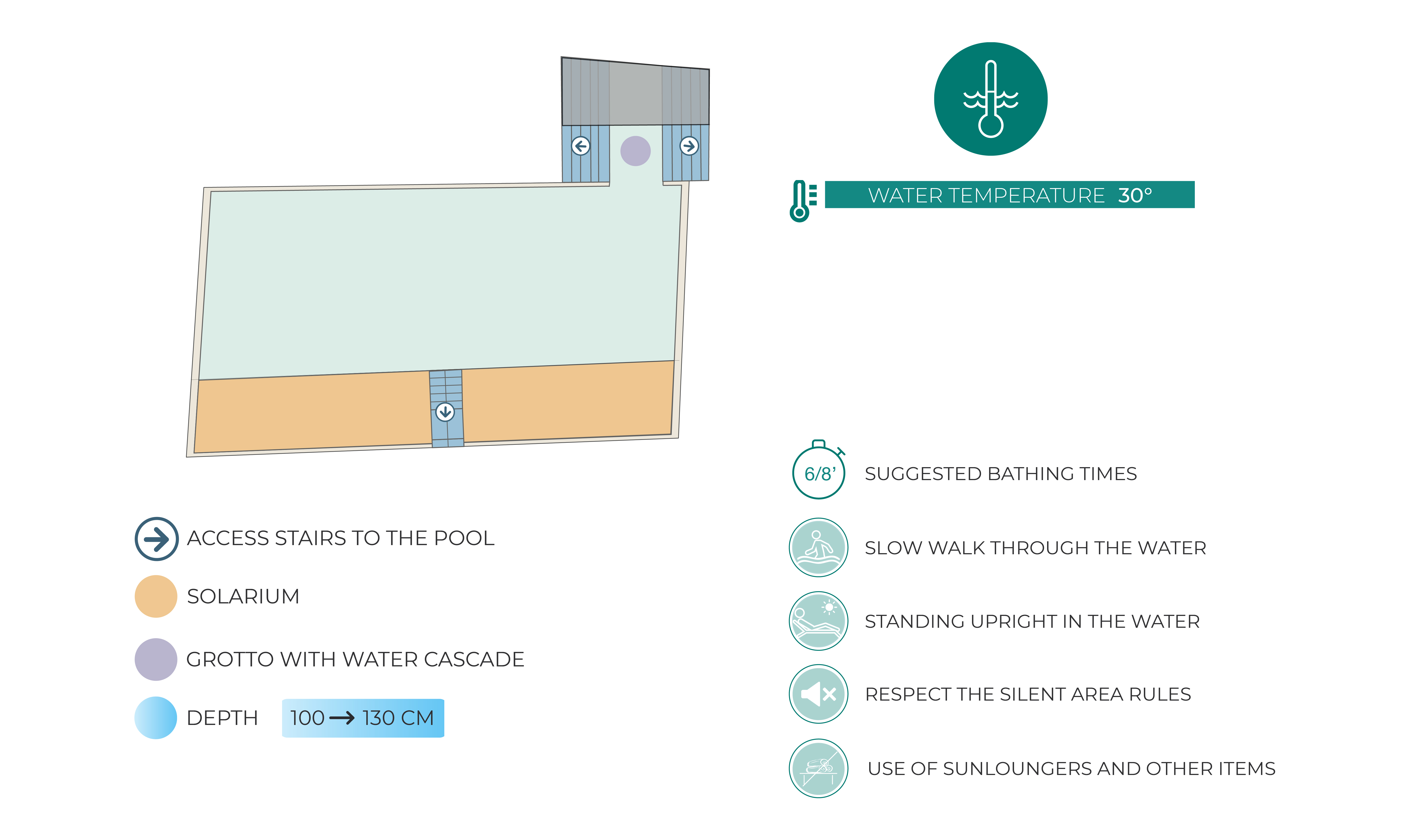 The water temperature is 30 degrees. The pool is surrounded by sun beds and umbrellas and, to its side, there is a small waterfall.